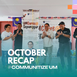 Universiti Malaya believes that universities have a responsibility to improve the quality of life and reduce disparities in the communities they serve. UMCares, or the Universiti Malaya Community Engagement Centre, was established to fulfill this responsibility and UMCares works closely with the community through community engagement projects and by involving community members in their initiatives. This allows UMCares to strategically target different demographic groups within the community to bring about positive change.